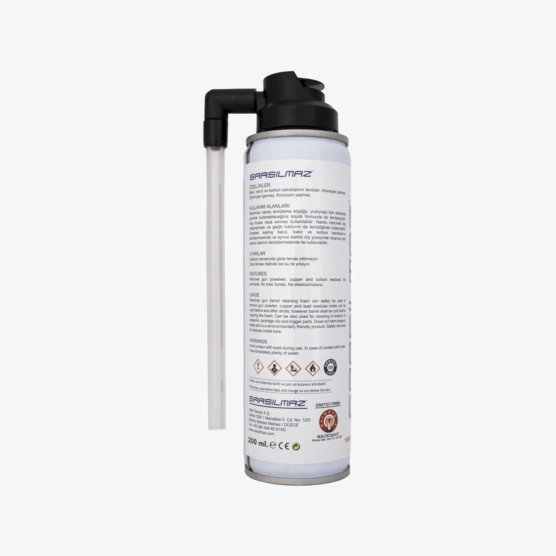 - Yivli ya da yivsiz tüm silahlarda güvenle kullanabileceğiniz köpük formunda bir temizleyicidir.